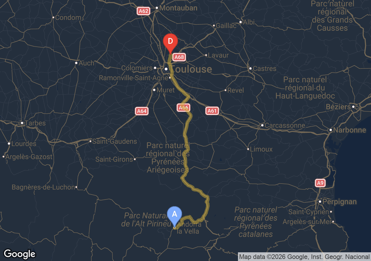 Le péage de l'A20 est inclus. La N20 (Ax-les-Thermes → Andorre) est gratuite.