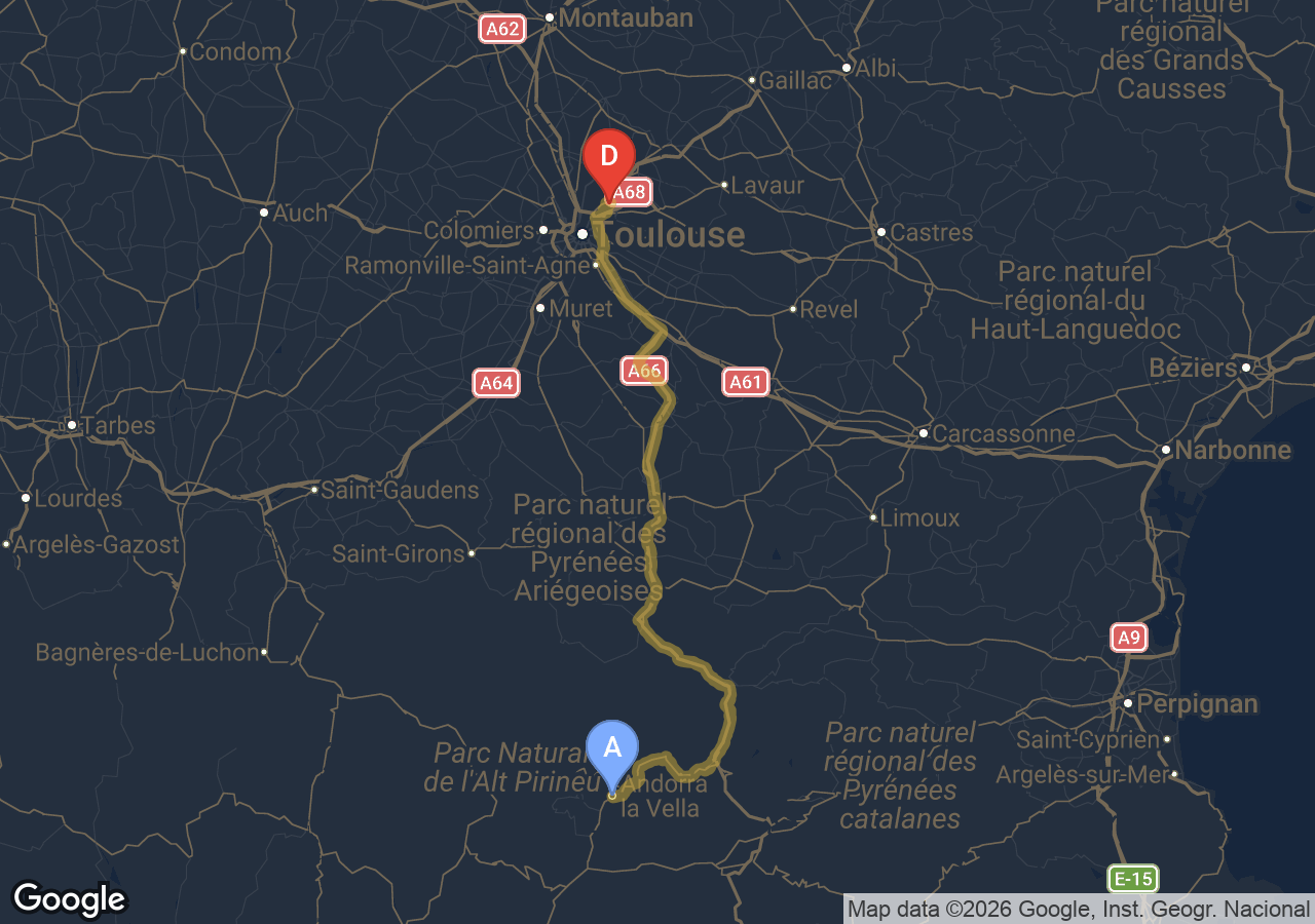 Trajets importants (Bordeaux, Carcassonne, Narbonne, Andorre...).