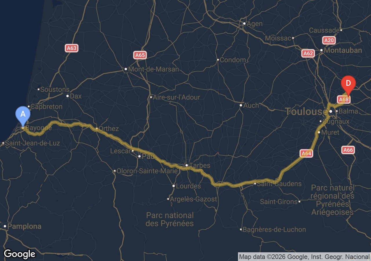 Estimé à 481 € TTC pour 283 km via la rocade et l'A64, péage A64 inclus.