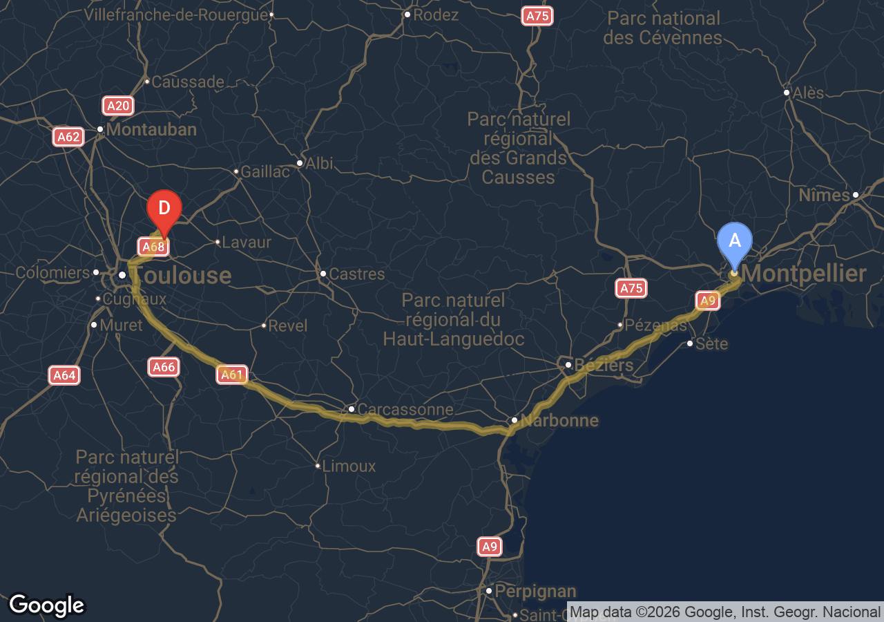 Trajets importants (Bordeaux, Carcassonne, Narbonne, Andorre...).