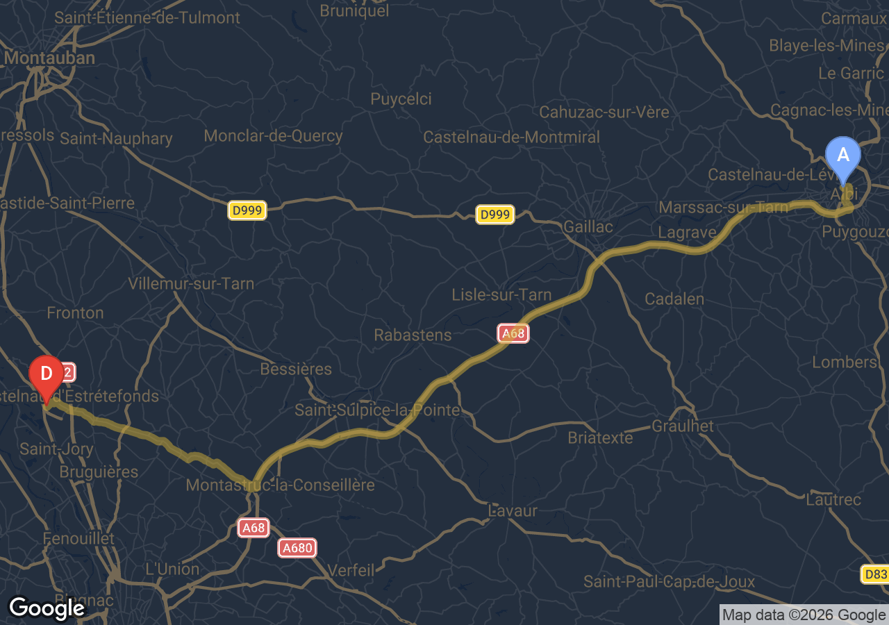 • Trajet direct Saint-Jory → Albi via A62/A68 — 100 km