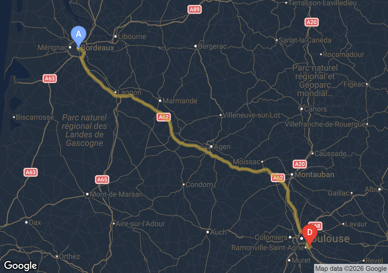 Environ 2h17min via la rocade et l'A62, hors trafic.