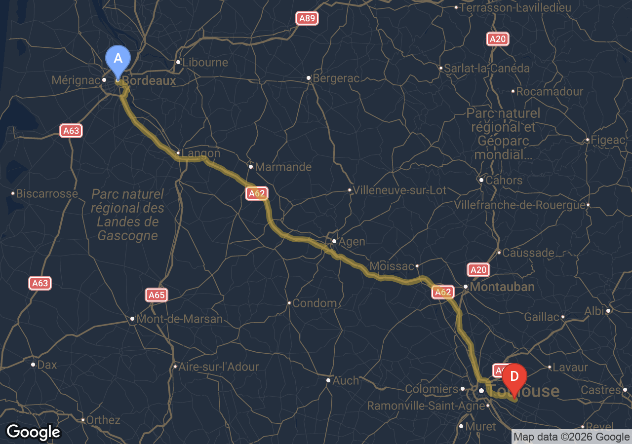 Environ 2h22min via la rocade et l'A62, hors trafic.