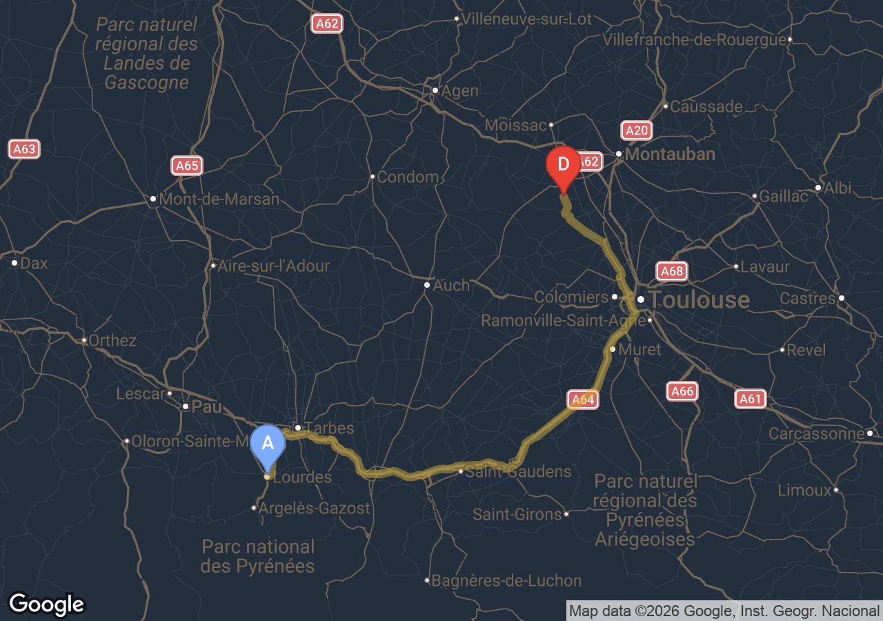 SSINT VTC assure votre trajet Saint-Sardos → Lourdes en Tesla Model 3. Depuis Saint-Sardos, commune à proximité de Toulouse, la route emprunte la rocade et l'A64 pour 181 km en environ 1h49min. Tarif fixe incluant péage. Idéal pour Sanctuaire Notre-Dame ou gare de Lourdes.