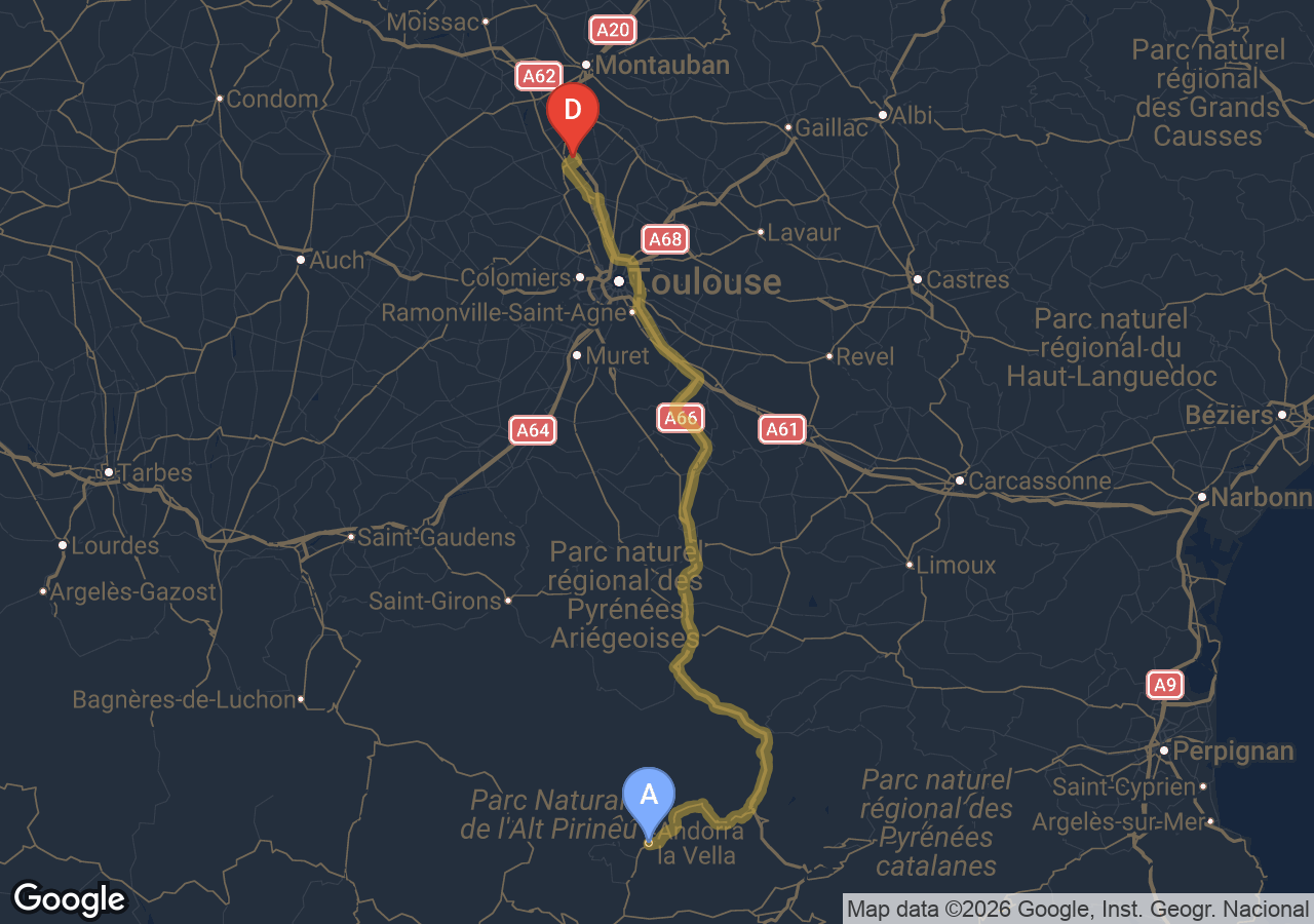 Le péage de l'A20 est inclus. La N20 (Ax-les-Thermes → Andorre) est gratuite.