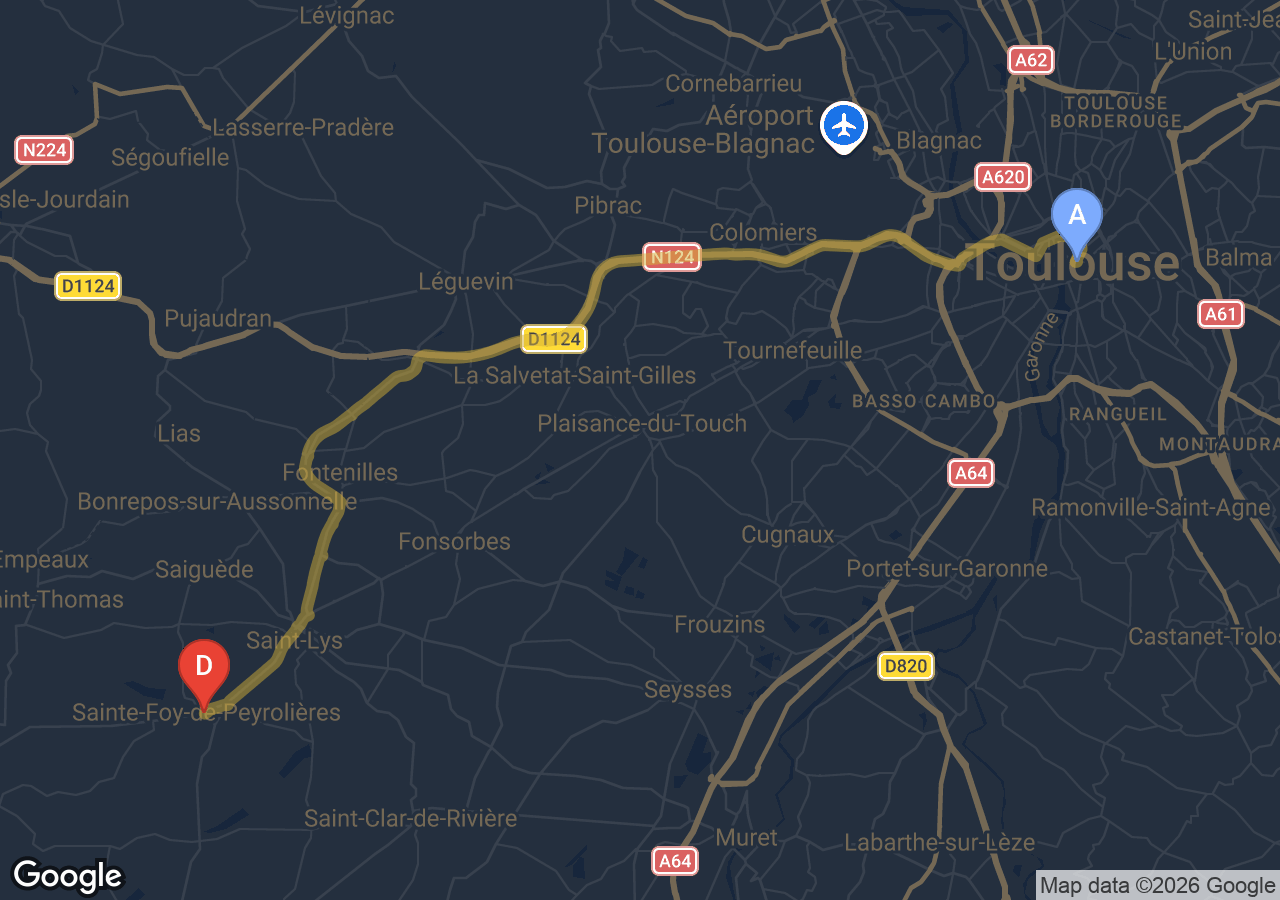 SSINT VTC assure votre trajet Sainte-Foy-de-Peyrolières → Toulouse en Tesla Model 3. Depuis Sainte-Foy-de-Peyrolières, commune de l'agglomération toulousaine élargie, la route rejoint Toulouse directement en 30 km et environ 45min. Tarif fixe confirmé avant départ. Idéal pour gare Matabiau, aéroport Blagnac ou Capitole.