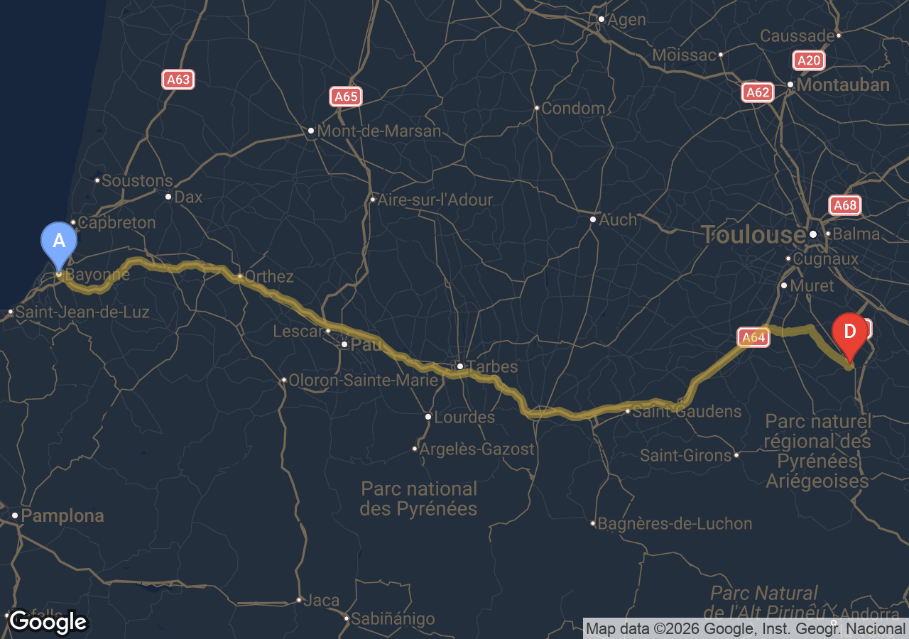 Trajets importants (Bordeaux, Carcassonne, Narbonne, Andorre...).