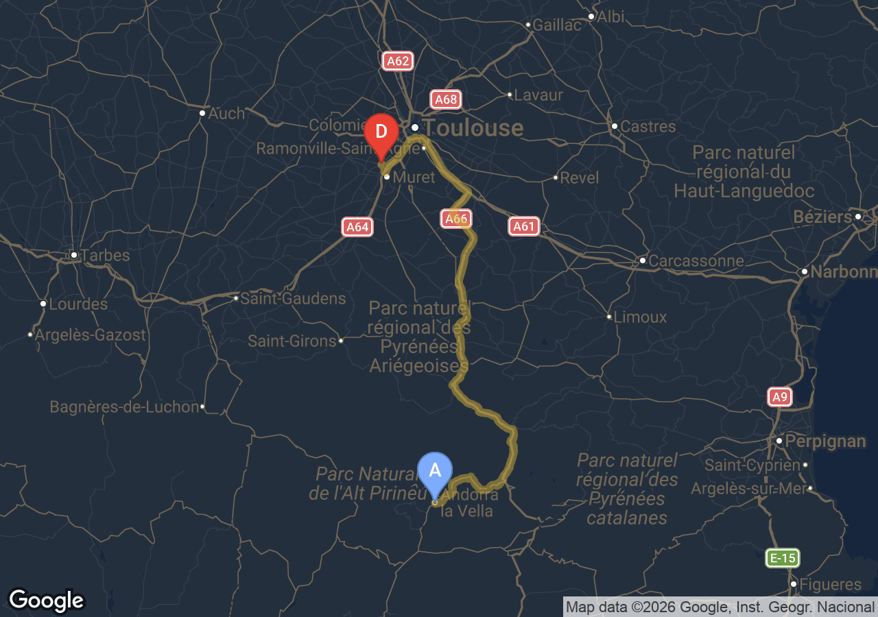 Trajets importants (Bordeaux, Carcassonne, Narbonne, Andorre...).