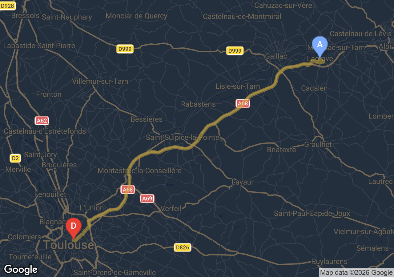 SSINT VTC assure votre retour depuis Toulouse vers Lagrave (81150), soit 52 km en 45 minutes. Idéal après un rendez-vous professionnel, une soirée ou un vol à Toulouse-Blagnac.
