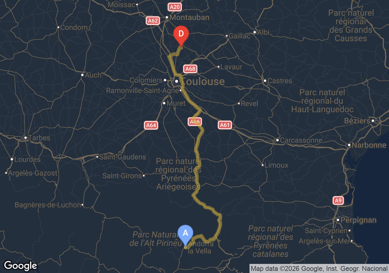 Le péage de l'A20 est inclus. La N20 (Ax-les-Thermes → Andorre) est gratuite.