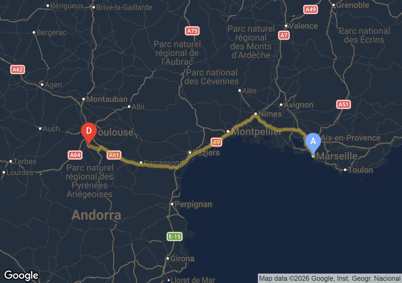 Trajets importants (Bordeaux, Carcassonne, Narbonne, Andorre...).