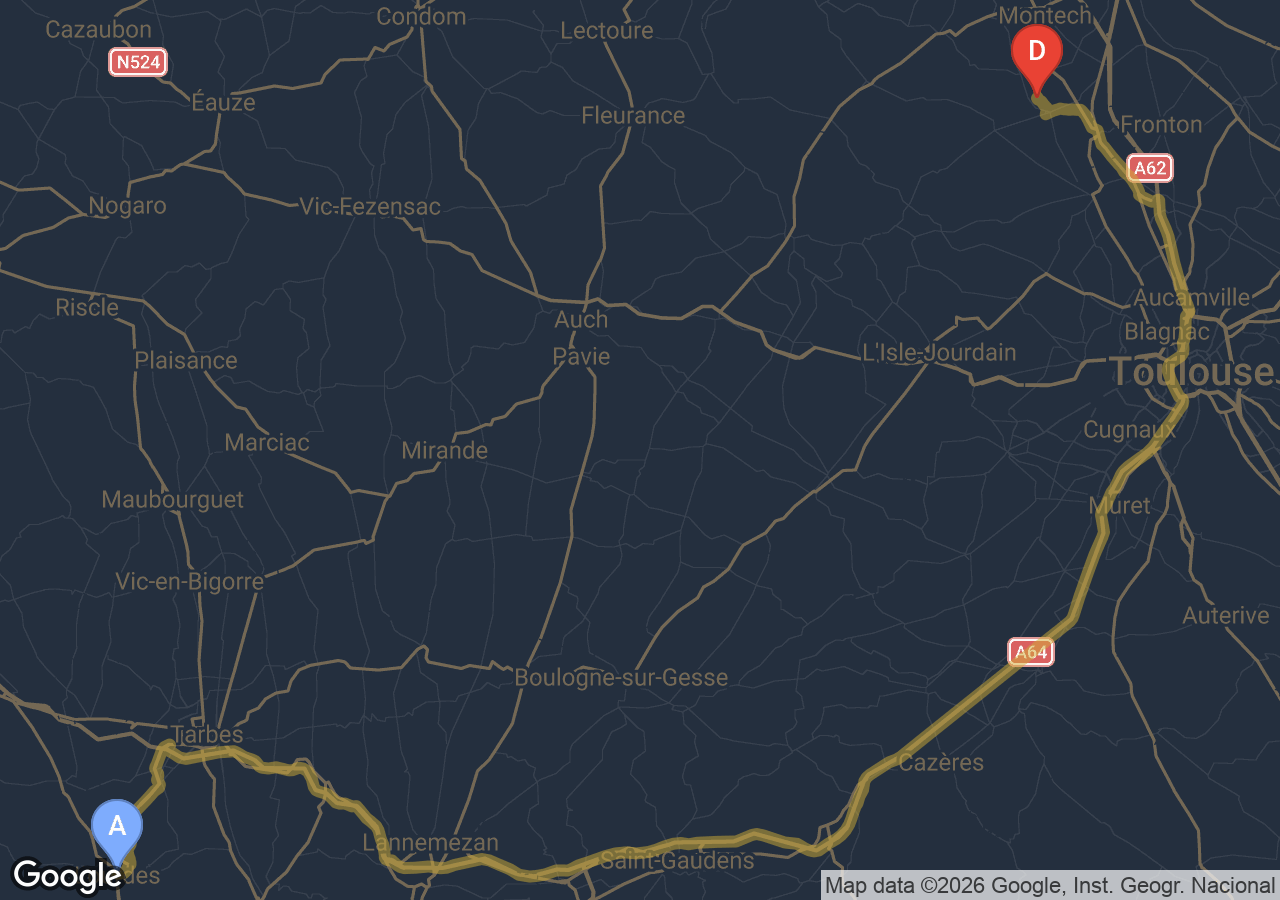 Estimé à 289 € TTC pour 169 km via la rocade et l'A64, péage A64 inclus.