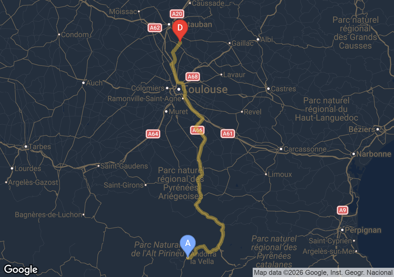 Trajets importants (Bordeaux, Carcassonne, Narbonne, Andorre...).