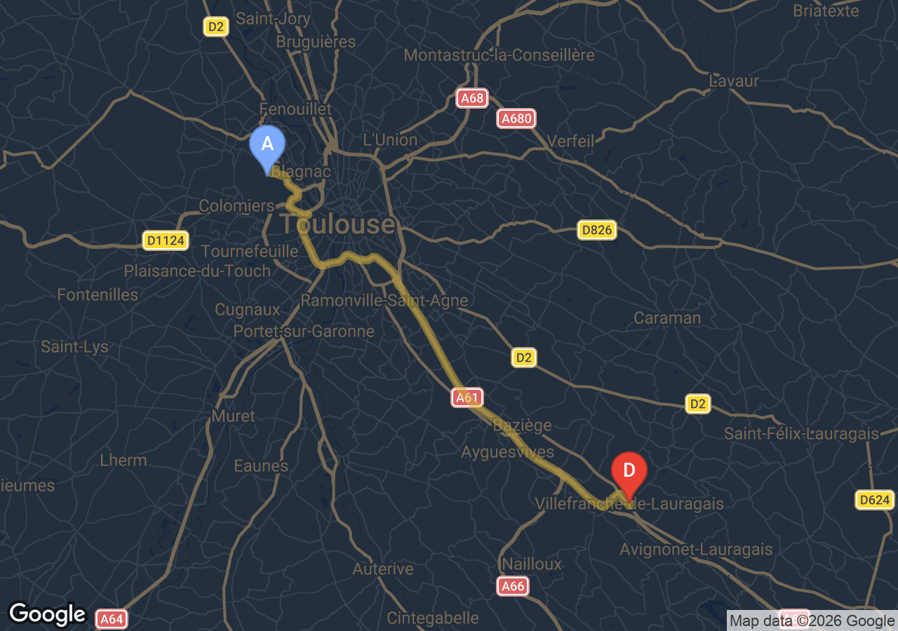 Disponible 24 h/24, 7j/7 pour votre trajet Villefranche-de-Lauragais → Aéroport Toulouse-Blagnac en toute sécurité et confort