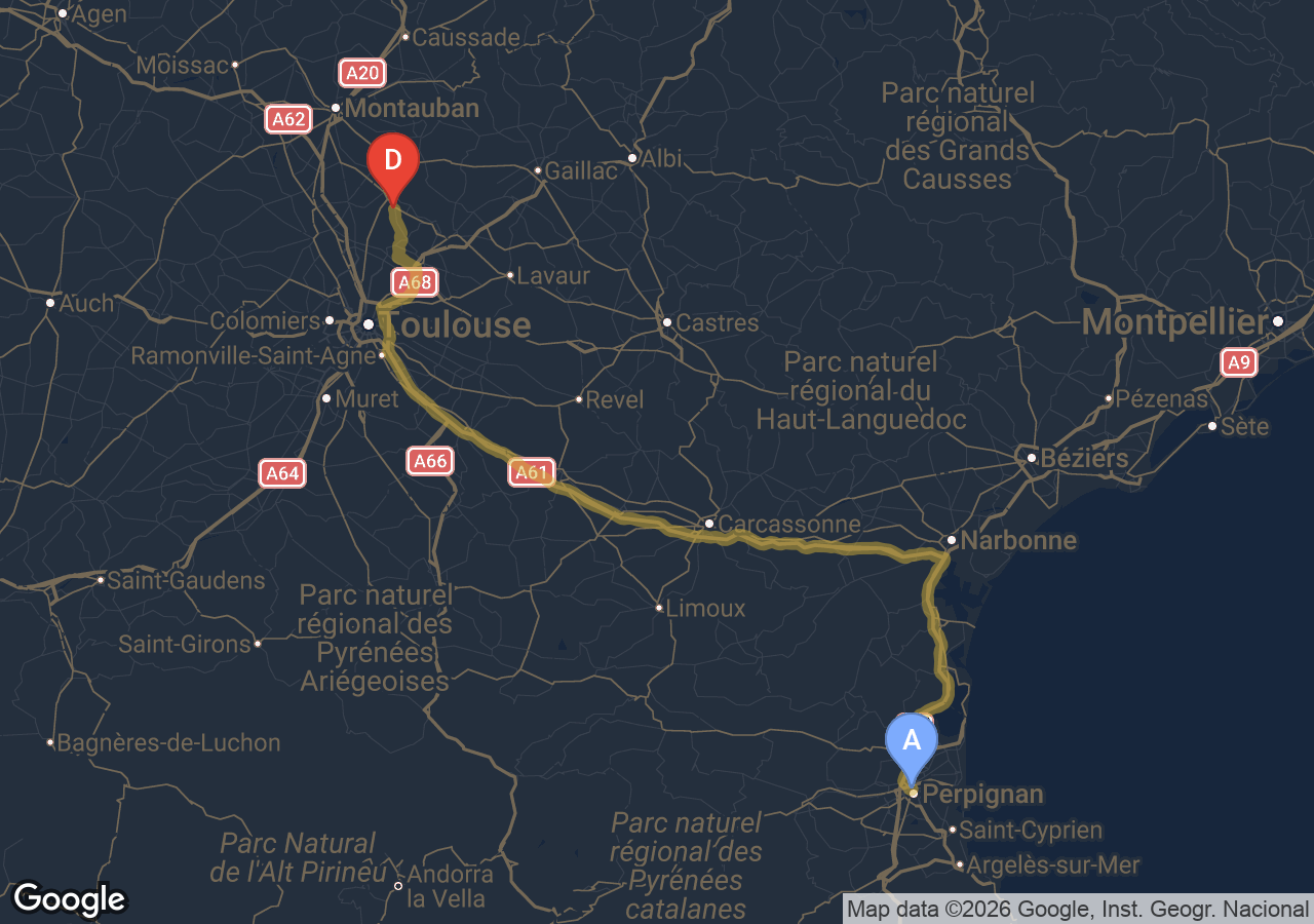 Estimé à 329 € TTC pour 193 km via la rocade, l'A61 et l'A9, péage A61/A9 inclus.