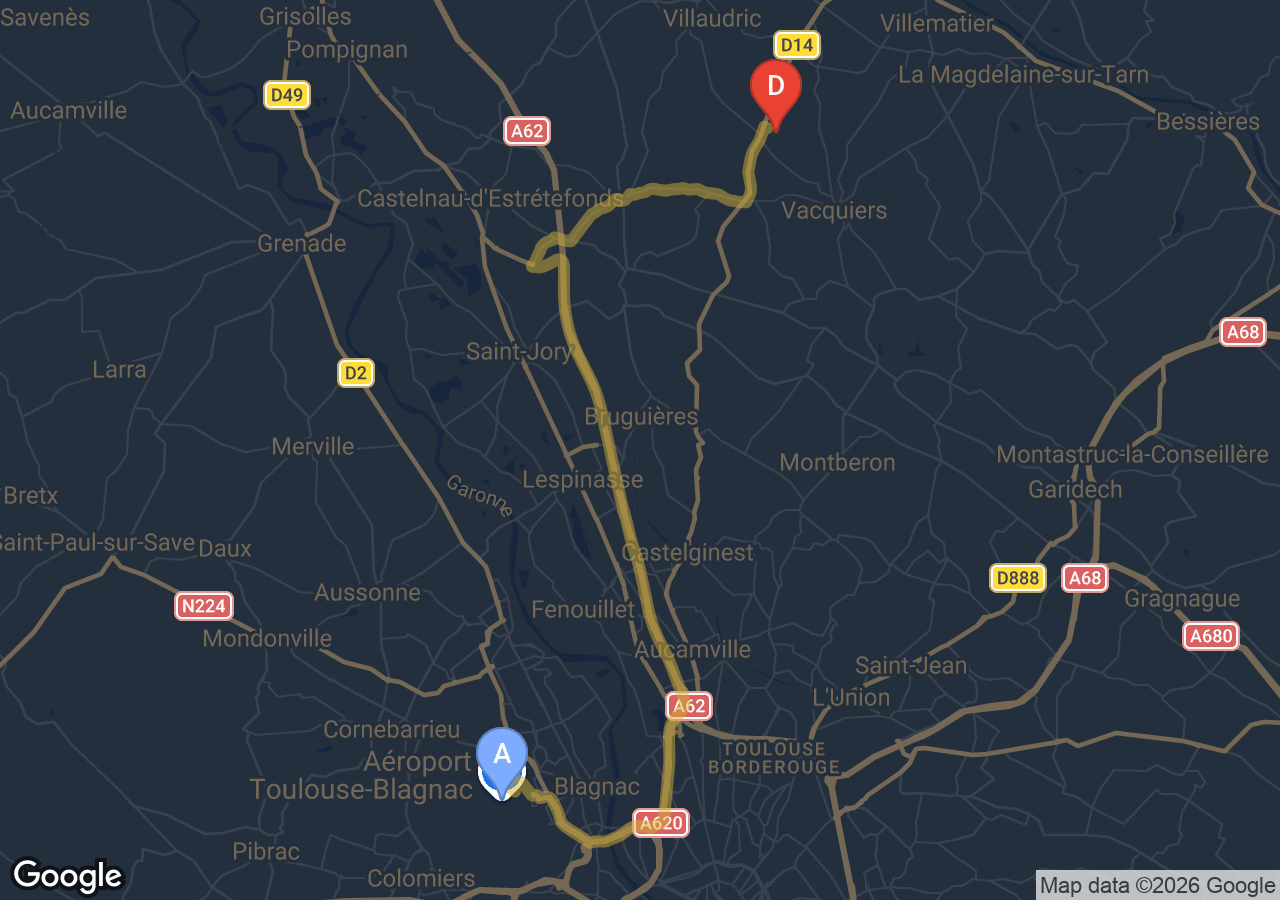 Disponible 24 h/24, 7j/7 pour votre trajet Villeneuve-lès-Bouloc → Aéroport Toulouse-Blagnac en toute sécurité et confort