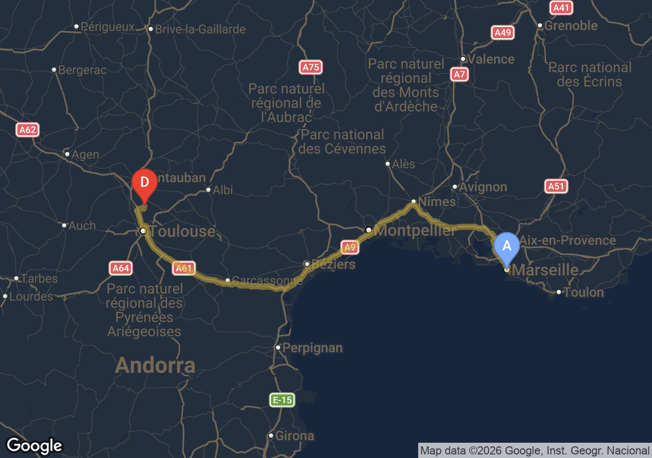 Trajets importants (Bordeaux, Carcassonne, Narbonne, Andorre...).
