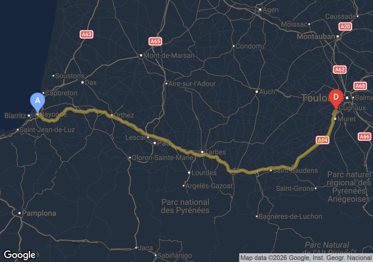 Estimé à 445 € TTC pour 262 km via la rocade et l'A64, péage A64 inclus.
